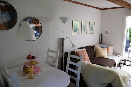 Välkommen till vår charmiga och trivsamma stuga i norra Mellbystrand, granne med naturreservatet Hökafältet och ca 500 m från havet. Stugan består av ett mindre kök med diskmaskin, badrum med dusch (finns även en utedusch!), två sovrum, varav det ena med dubbelsäng (160 cm) och det andra med enkelsäng. I vardagsrummet finns en bekväm bäddsoffa med sängplatser för två. Här finns också ett matsalsbord samt en mysig och värmande öppen spis. I uterummet finns en matsalsgrupp och soffa. I den stora trädgården finns flera sittytor (bland annat en soffa i söderläge) och Lillstugan; en friggebod med fyra sovplatser. Cyklar finns för utlåning för att enkelt och snabbt ta sig ner till den långa, fina sandstranden, till affären, till Strandhotellet för en bit mat eller minigolf eller kanske en utflykt till Laholm eller Båstad.