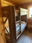 Ett sovrum med dubbelsäng och två sovrum med våningssäng. Öppen spis och