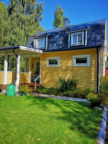Allrum med braskamin, badrum med dusch, toa , gästtoalett .