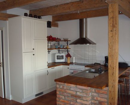 Ett rymligt boende på 80 m2, där stallbyggnadens takhöjd med de fina ursprungliga takbjälkarna har bevarats.