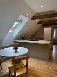 I flygelbyggnaden intill finns ytterligare en lägenhet. På övervåningen ett sovrum med dubbelsäng, ett allrum med sovalkov med tre sängplatser samt WC. Totalt 5 sängplatser. I entréplan kök med matplats samt badrum med dusch, handfat och bastu.