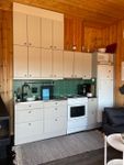 I allrummet finns matbord med 6 stolar, köksdel med spis, micro, kaffebryggare, våffeljärn o övrig köksutrustning. Kylskåp o liten frys.