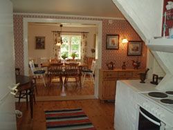 Nedervåning = kök, dusch, matrum/TV-rum + 2 sovrum med 2 bäddar i varje + ett litet rum med en enkelsäng.