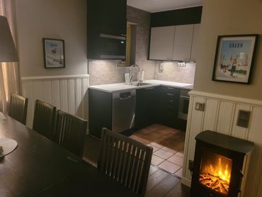Välutrustat kök med kyl/frys, mikrovågsugn och diskmaskin.