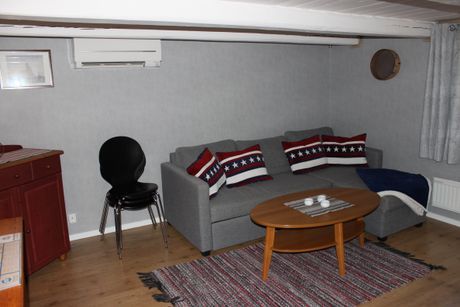 Allrum med bäddsoffa för två och tv. Bredband och Wi-fi finns.