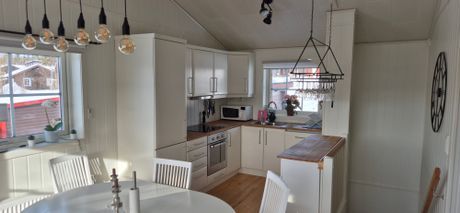 Fullt utrustat kök med diskmaskin och mikro, stort kök och allrum i öppen planlösning.
