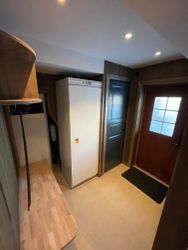Hall med torkskåp och avhängning, låsbar dörr till trappan som leder till övre lägenheten.
