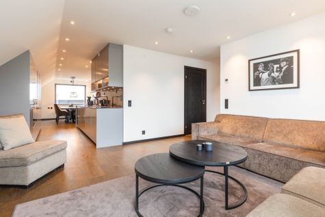 Lägenheten har en ljus, öppen planlösning i U-form med fullt utrustat och modernt kök med micro, diskmaskin, spis, ugn, kyl och frys. Stor soffa i vardagsrum med platt-TV, stora fönster med fantastisk utsikt över sjö och fjäll. Boendet har en stor inglasad balkong i västerläge och en mindre balkong mot väst.