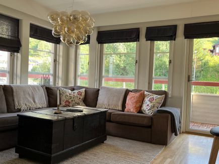 Vardagsrummet är det trivsamt med stora fönsterpartier och stor soffa.
