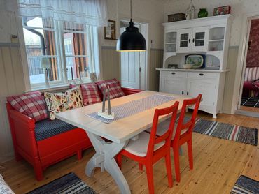 4 sängplatser i helt nyrenoverat och vinterbonat härbre med sovloft. En bäddsoffa som utfälld blir 140 cm, samt två singelbäddar uppe på sovloftet. OBS! Sovloftet är jättemysigt, men stegen upp är brant och loftet är högt så inte anpassat för små barn.