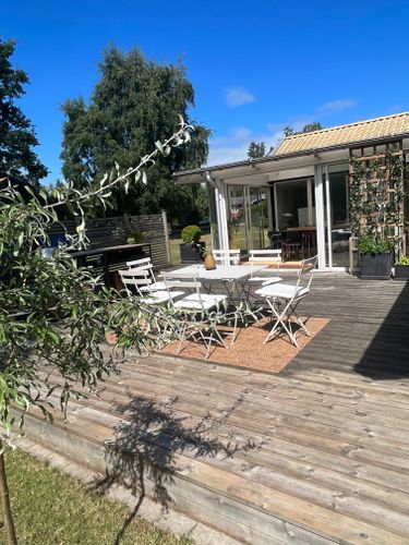 Huset har ett mysigt uterum, en stor härlig uteplats, stor parkering och utekök med gasolgrill och kolgrill för de matintresserade.
