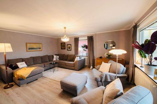 Vardagsrum 1: Soffa med plats för minst 8 personer, två bekväma fåtöljer med fotpall och en 55 tums platt tv uppkopplad med Cromecast.