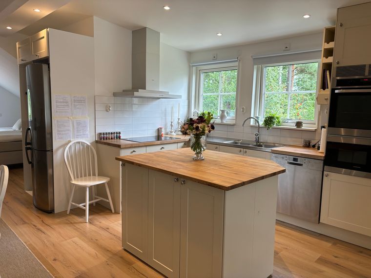 Stort kök med kyl/frys, diskmaskin, ugn, microvågsugn, kaffebryggare och vattenkokare.