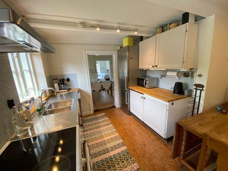 Det finns ett stort välutrustat kök, matrum och ett stort vardagsrum. TV rum på ovanvåningen samt liten TV i barnens rum. Det finns ett badrum med toalett, badkar/dusch och en liten toa på övervåningen.