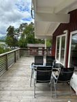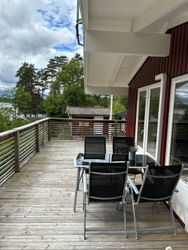 Stor altan på 3 sidor av huset med utsikt över Uppsjön, skogen och badplatsen. På altanen finns 2 olika matplatser. Mindre altan med solstolar finns vid sidan av gäststugan. På den delvis inhägnade tomten finns tillgång till grill, kubbspel och SUP-bräda.