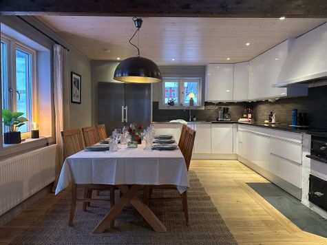 På entréplan välkomnas man in i en liten hall med klinkergolv i anslutning till kök och matplats. Köket är fullt utrustat med spishäll, ugn, diskmaskin, mikro samt fullhöjd på kyl respektive frys. Runt middagsbordet finns 8 stolar.