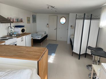Studion ligger i Strandbaden med barnvänlig sandstrand precis nedanför huset. Studion är på 45 kvadrat med kök, vardagsrum, sovplats för två personer ,garderob samt kaklad dusch och toalett. Det finns också en bäddsoffa med plats för två personer. Köket är utrustat med spis kylskåp, fläkt, micro och frys.