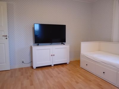 Lägenheten är inredd med en bäddsoffa som kan dras ut till en dubbelsäng, toalett, dusch, matplats, litet kök med kyl, micro, kokplattor och kaffebryggare.