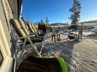 Runt huset finns en rejäl altan, här kan du njuta av den otroligt vackra utsikten över fjället i bästa solläget.