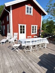Välkommen till Rödlöga by! Vi befinner oss långt ut i den i den yttersta skärgåden. Huset är ljust och rymligt (ca 150 m2), bottenvåningen har ett stort och välutrustat kök med kyl och frys. Diskar gör man för hand genom att värma vatten på spisen. I matrummet finns en vacker järnkamin och ett stort matbord med fantastisk utsikt över inloppet till Rödlöga. På bottenvåningen finns ett stort sovrum med fönster i tre väderstreck, en dubbelsäng med en dörr ut till den stora terassen. På övervåningen, ett härligt allrum med soffa och flera fåtöljer, också det med panoramafönster mot vattnet, samt två rymliga sovrum med två sängar i varje rum (kan bäddas som dubbelsängar eller som två enkelsängar).