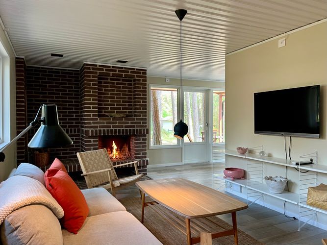 Vardagsrum med soffa, TV, matplats, öppen spis, glasdörrar mot uteplats. Fullt utrustat kök, badrum med dusch/handfat/toalett, separat tvättstuga. 3 sovrum (totalt 5 sängplatser).