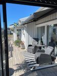 Inglasad pergola inredd med sittmöbel. Terrassen finns med matbord för 8 personer, samt en mindre sitthörna.
