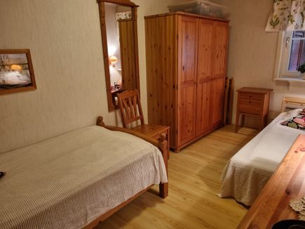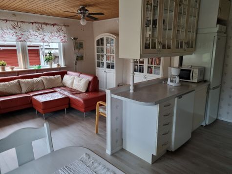 Öppen planlösning och välutrustat kök med diskmaskin. Toalett med dusch. Ett sovrum med dubbelsäng och ett sovrum med två enkelsängar. På tomten finns ett gästrum med två våningssängar och en Friggebod med bäddsoffa och en spjälsäng.I anslutning till detta finns ytterligare en toalett med tvättmaskin och en duschkabin. Huset är mycket ljust och trevligt. Ett underbart stort soldäck och en klinkersbelagd tomt. Lekplats och lekytor i området. Nära till Haga Parks camping som är Sveriges vindsurfing center med uthyrning av utrustning. Underbara cykel, jogging och vandringsleder.