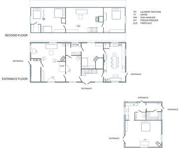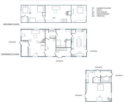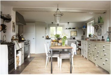 Köken är utrustade för matlagning. I huvudhuset finns kyl, frys, spis, elugn, diskmaskin samt mindre köksutrustning som brödrost och vattenkokare. I det mindre huset finns gasspis, elugn och kylskåp.
