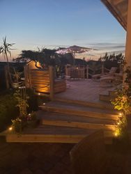 Uteplatser, i väster (mot havet) Matplats stort runt matbord med 7-8 sittplatser, upphöjt trädäck med två
