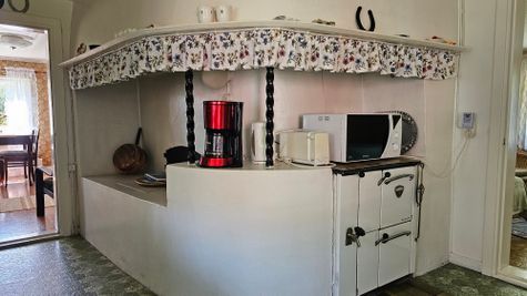 Huset rymmer upp till 5 personer fördelat på två sovrum med vardera två enkelsängar, varav ett med lågt i tak (ca 190 cm). Här finns ett charmigt kök med matplats och den gamla vedspisen som inredningsdetalj, vardagsrum med soffa, matsalsmöbel och TV, samt badrum med dusch och WC. Från den lilla verandan med korgmöbler blickar ni ut över trädgården.