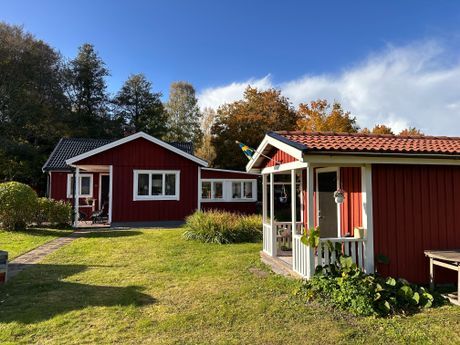 Toaletten hittar ni i stora stuga. Stugan är utrustad med både tvättmaskin och diskmaskin. Mysig inglasad altan där ni kan sitta när vädret är lite kyligare. Stor tomt och gräsmatta för utelek.