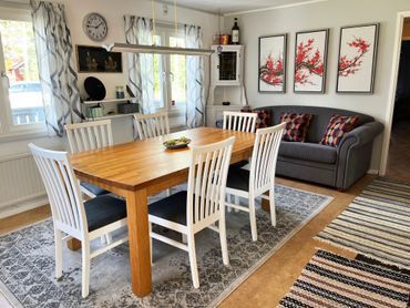 Via altanen på framsidan når ni entrén. Till höger om hallen finner ni badrummet som är utrustat med både dusch och tvättmaskin. Sedan till vänster når ni vardagsrummet som är bekvämt möblerat och har en öppen spis. Intill finner ni köket som via altandörren leder er ut till ett stort altandäck, där ni kan sitta och umgås på dagarna. Även på framsidan finns ett altandäck. Från båda har ni viss utsikt över sjön. Tomten är bra som ni kan nyttja till flertalet olika aktiviteter.