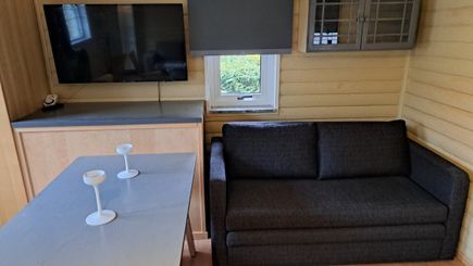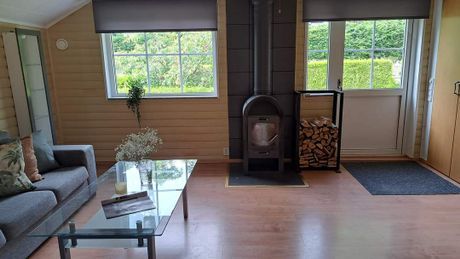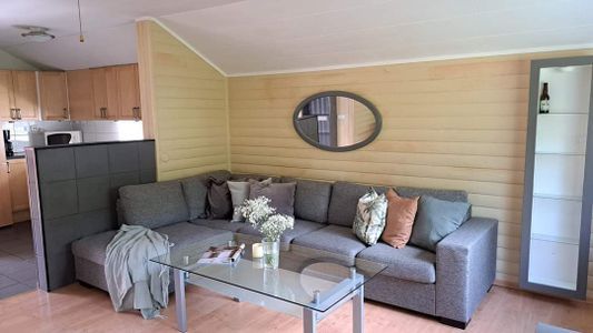 Modern året-runt-stuga med sovstuga, två uteplatser, en skuggig pergola och en öppen solplats med grill, i syd-västligt läge, med egen uppfart och trädgård. Fritt tillträde till områdes badanläggning 25m-bassäng och baby-pool, 12 håls minigolf och lekplats på ca 15 min gångavstånd.