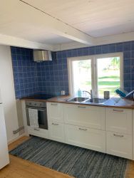 Vi hyr ut vår fina sportstuga med underbar ängs- och skogstomt vid havet. Havsutsikt från kök, vardagsrum och den stora altanen i söder.