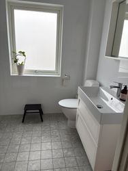 Huset har två badrum med dusch och toalett, ett på övre plan och ett på nedre plan.
