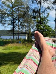 Där finns en eka, två kanoter och en SUP mm. Flytvästar i olika storlekar finns också. Där finns en vedeldad badtunna och även en bastu. Gräsmatta, fotbollsmål, skog, barr, blåbär, svamp... You name it! :)