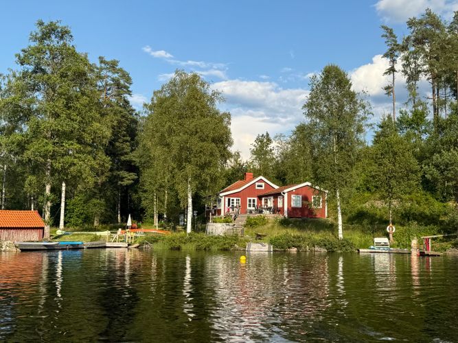 Stor tomt (nästan 10.000 m2) med egen strand. Det finns en badbrygga och en båtbrygga samt en liten badvik för de minsta.