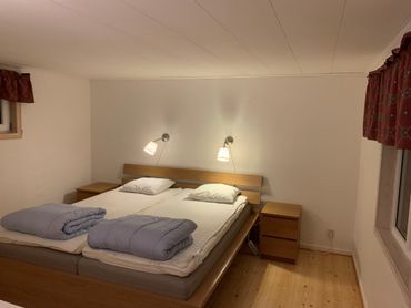 Ett sovrum med dubbelsäng och 2 andra med 1 våninggsäng vardera.
